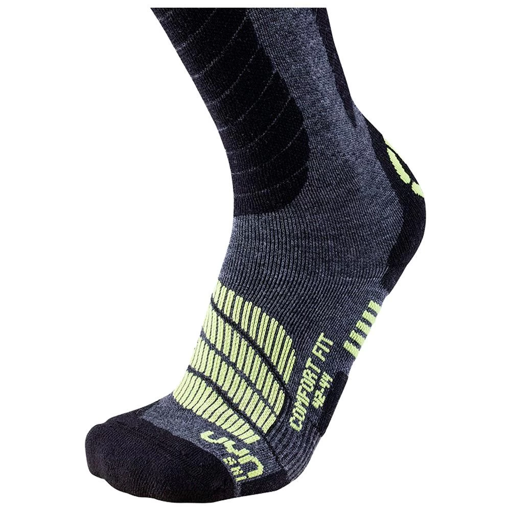 Les chaussettes de ski homme UYN Comfort Fit épousent confortablement les pieds, les chevilles, les mollets et les tibias. Elles offrent de très bons amortis contre les chocs notamment au niveau de la voûte plantaire et du cou-de-pied. Elles protègent également l’avant des chevilles sur le haut du pied, les malléoles, ainsi que la partie sensible des tendons d’Achille.
