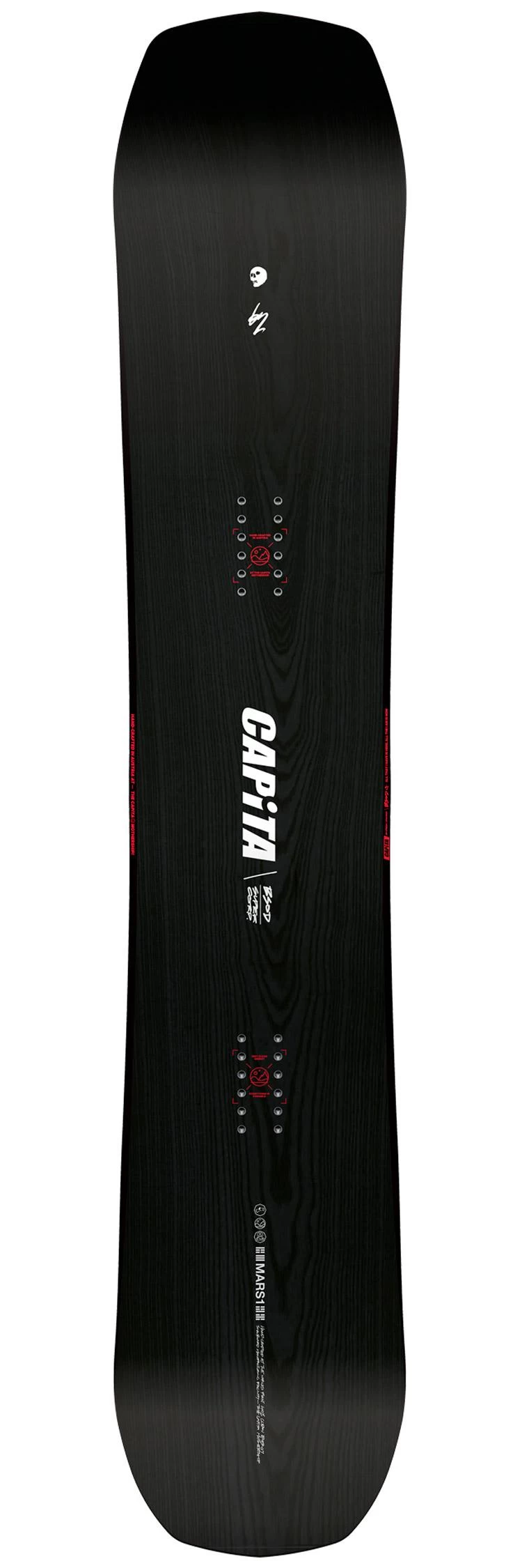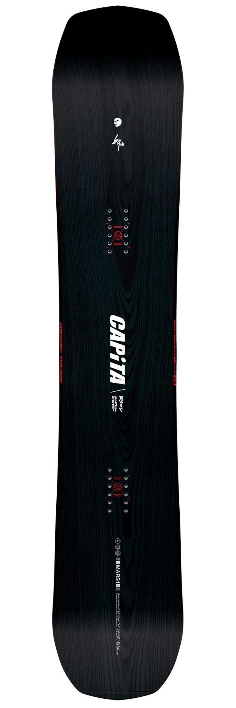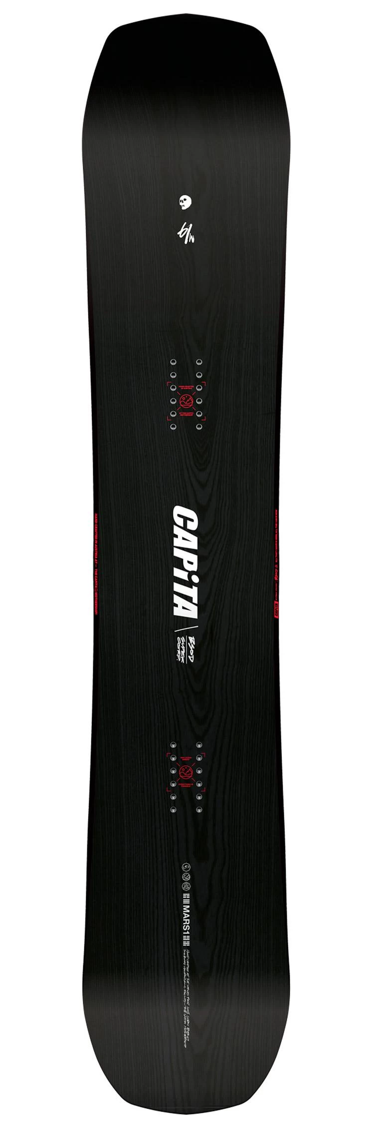 Grâce à sa forme, son flex et ses inserts directionnels, The Black Snowboard Of Death offre d’emblée un pilotage précis et fonctionne sur tout type de neige. Les courbes sont faciles à enclencher, la board déjauge sans effort, d’autant plus grâce aux rockers avant et arrière, et le cambre classique offre l’accroche nécessaire sur neige dure. Mais Capita ne s’est pas arrêtée là et a donné le meilleur de son savoir-faire à cette board haut de gamme. Ainsi, on retrouve un noyau hybride Themopolymer Hover Core, avec du bois et du carbone pour un résultat ultra léger et robuste tout en possédant d’excellentes propriétés d’amorti. Ce n’est pas tout. On retrouve encore du carbone supplémentaire et des fibres lin, le tout placé stratégiquement pour être plus puissant et amortir encore mieux les vibrations. Enfin, le flex est maîtrisé grâce à la double couche de fibre de verre triaxiale et on obtient une board puissante et qui ne tremble pas même à haute vitesse, tout en gardant du confort dans les appuis puisqu’elle n’est pas non plus trop rigide. De quoi tartiner toute la journée sur tout le domaine skiable.