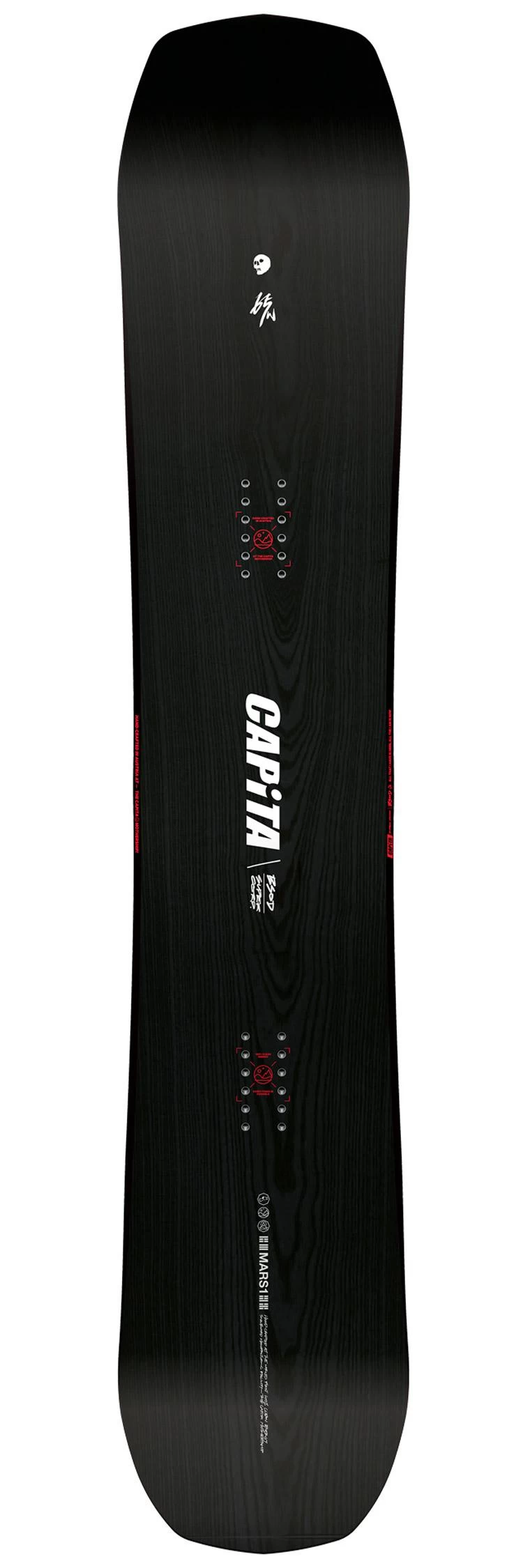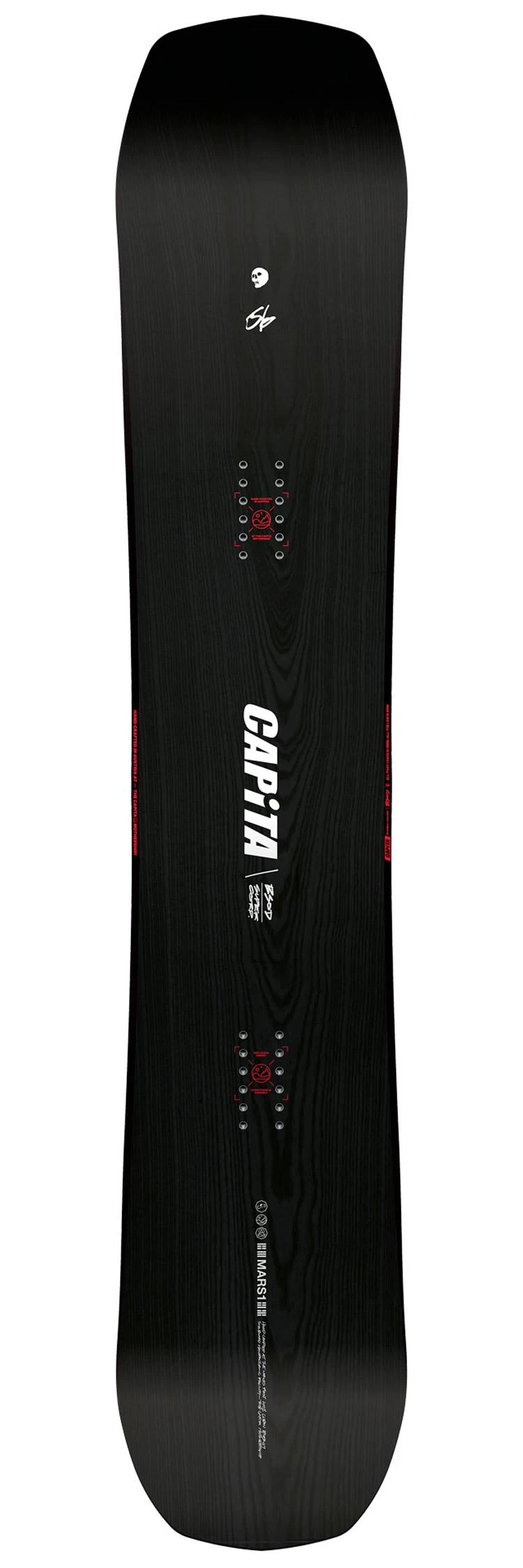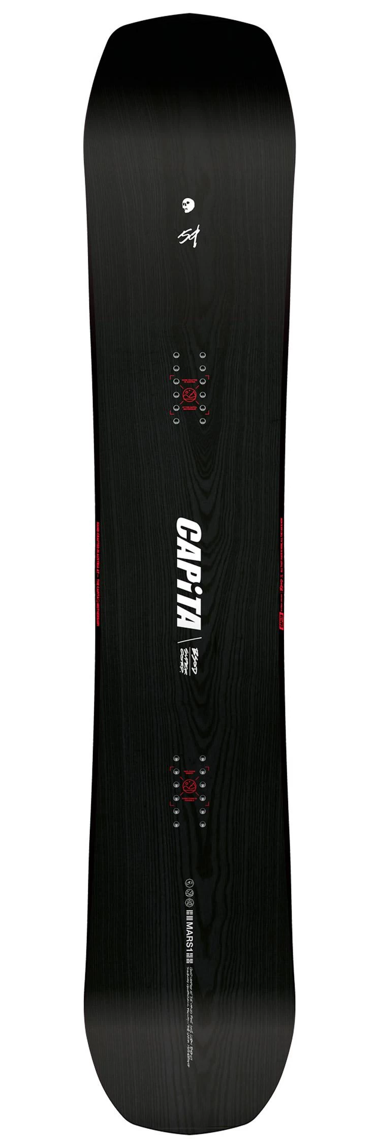 Grâce à sa forme, son flex et ses inserts directionnels, The Black Snowboard Of Death offre d’emblée un pilotage précis et fonctionne sur tout type de neige. Les courbes sont faciles à enclencher, la board déjauge sans effort, d’autant plus grâce aux rockers avant et arrière, et le cambre classique offre l’accroche nécessaire sur neige dure. Mais Capita ne s’est pas arrêtée là et a donné le meilleur de son savoir-faire à cette board haut de gamme. Ainsi, on retrouve un noyau hybride Themopolymer Hover Core, avec du bois et du carbone pour un résultat ultra léger et robuste tout en possédant d’excellentes propriétés d’amorti. Ce n’est pas tout. On retrouve encore du carbone supplémentaire et des fibres lin, le tout placé stratégiquement pour être plus puissant et amortir encore mieux les vibrations. Enfin, le flex est maîtrisé grâce à la double couche de fibre de verre triaxiale et on obtient une board puissante et qui ne tremble pas même à haute vitesse, tout en gardant du confort dans les appuis puisqu’elle n’est pas non plus trop rigide. De quoi tartiner toute la journée sur tout le domaine skiable.