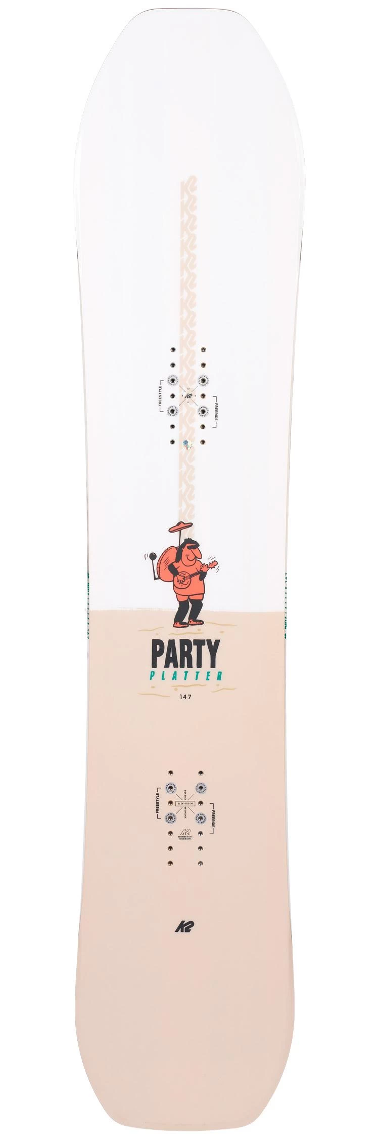 La K2 Party Platter Design est un snowboard polyvalent qui permet de tout faire, du freeride comme du freestyle. À l’aise dans la poudreuse, elle intègre un shape directionnel, un tail légèrement resserré par rapport au nose, ainsi qu’un rocker avant bien prononcé qui améliore la déjauge et accroit sa maniabilité. Le cambre classique, le flex équilibré et la position bien centrée des pieds sur la board permet d’utiliser la Party Platter Design pour assouvir vos pulsions de freestyle en passant sur piste et au snowpark. L’accroche est bonne, elle assure d’avoir de la relance en virage et profite d’un pop très tonique, grâce à la technologie de renfort Ollie Bar. Cela rend ce modèle parfait pour un usage all-mountain, afin de prendre la montagne pour son terrain de jeu, que ce soit pour slasher la peuf en faisant de belles courbes, aller graber avec style au park ou en prenant un kicker naturel pour expérimenter vos plus belles rotations !