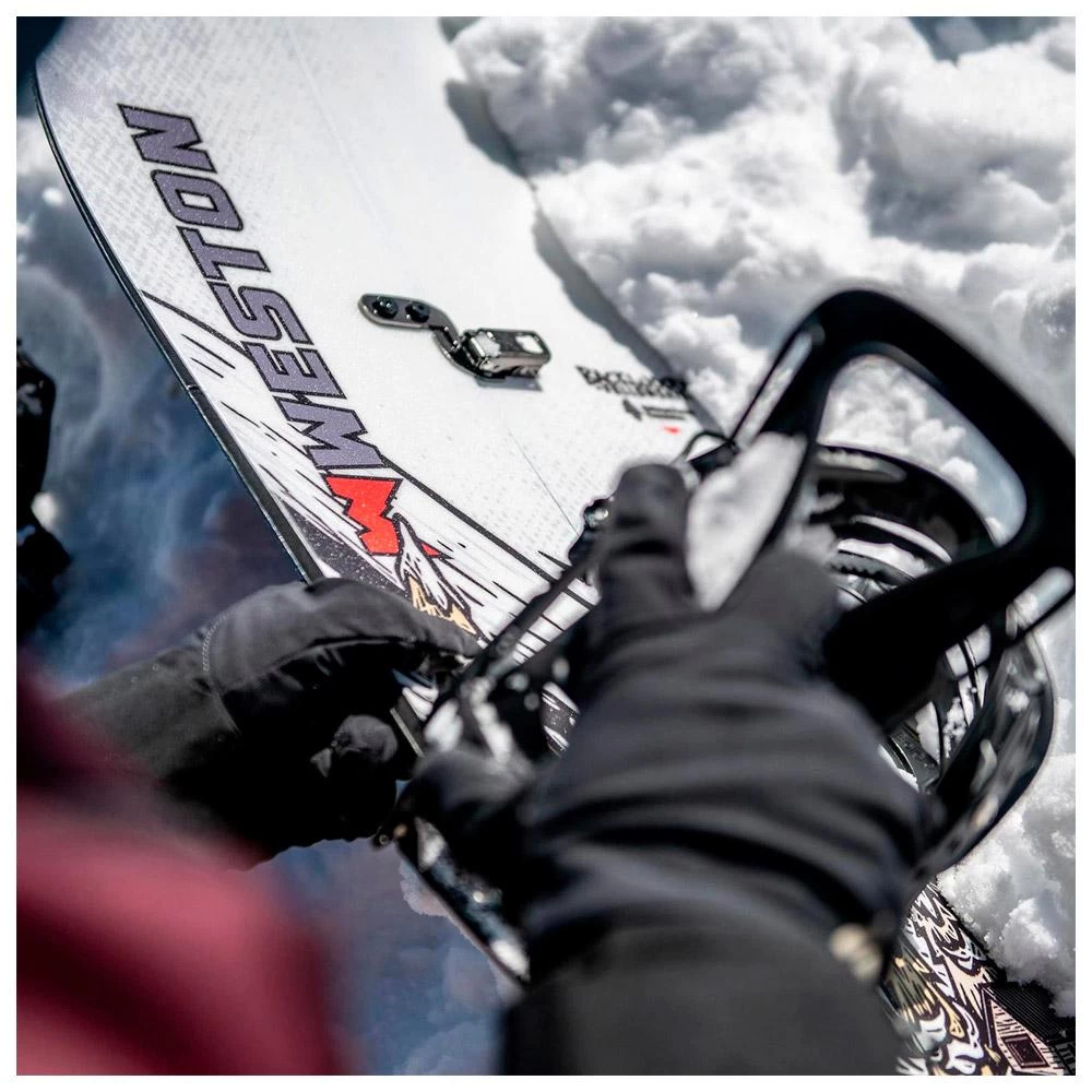 La Weston Backwoods est un splitboard performant, avec une forme directionnelle et un flex pêchu. Le noyau bois renforcé de fibre de verre triaxiale et de longerons de carbone permet d’avoir une bonne rigidité en torsion et un rebond puissant. C’est donc une board qui ne tremble pas à haute vitesse et qui relance bien dans les virages. Pour autant, elle garde un peu de flex longitudinal pour ne pas être trop physique dans les jambes. La forme directionnelle et la position reculée des pieds permet d’avoir une entrée de courbe vraiment rapide et les virages s’enchainent bien quel que soit le terrain. Le cambre classique apporte une accroche solide sur le dur, tandis que la déjauge est vraiment facile même dans la grosse poudreuse. De quoi s’offrir de belles descentes entre les sapins mais également pouvoir faire des redescentes sur piste.